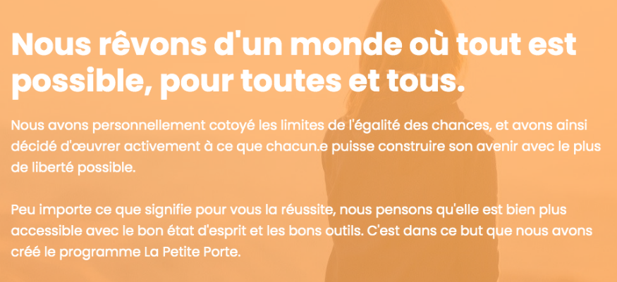 Réussir à s'affirmer en tant que femme dans des sphères personnelles et professionnelles majoritairement masculines, c'est un défi que la formation La Petite Porte propose à chaque femme de relever.